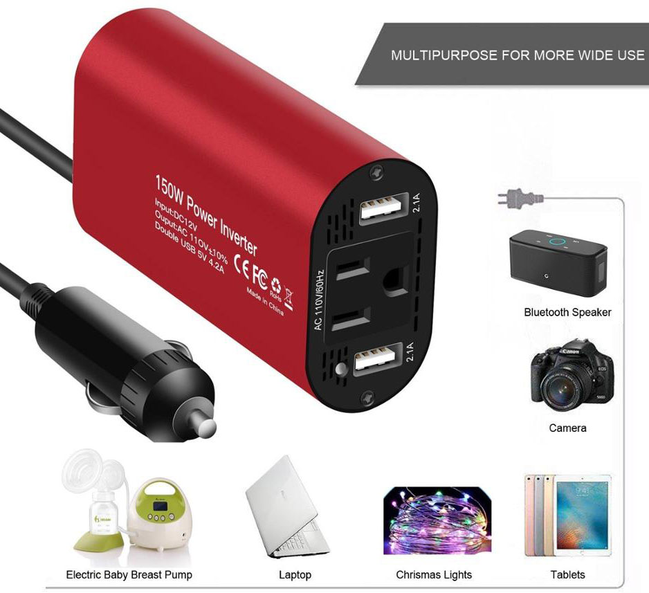1. 150W Car Power Inverter - 110V Output & Dual USB Ports power up and recharge your electronic device through this inverter.