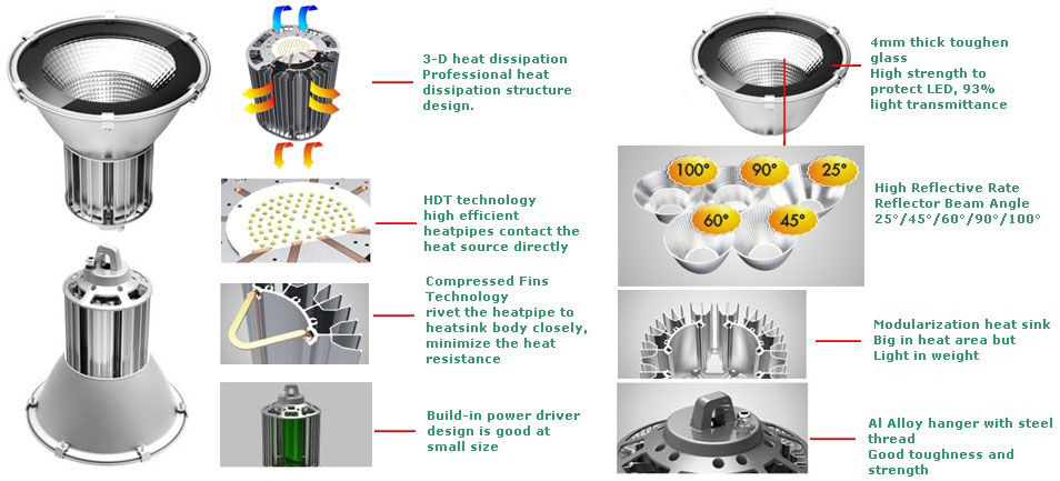 Bulkhead LED high bay light with built-in driver, and pure aluminum body. The 3-D heat dissipation and HDT technology makes heat dissipation quickly. Pure Aluminum reflector with high Reflective Rate, 25°/45°/60°/90°/100° Angle selection suitable for different situation.