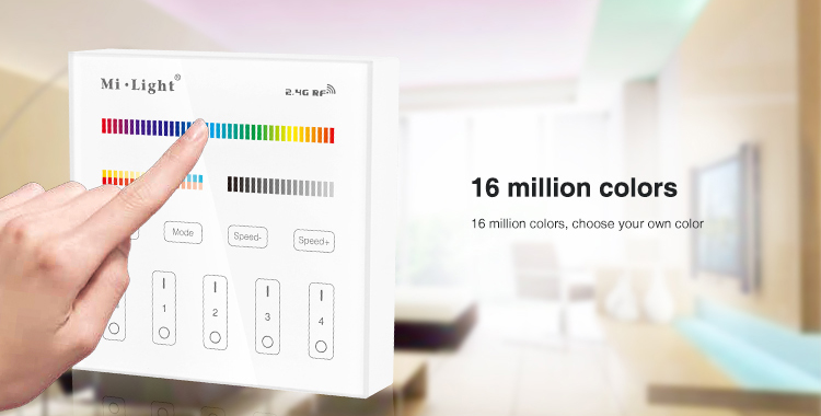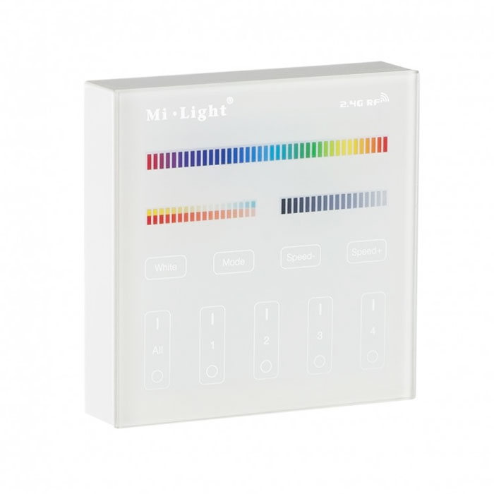 Wall-mounted RGB+CCT controller - Mi-Light, is a wireless wall panel for brightness management with the ability to control a given RGB colour and CCT colour temperature for multi-colour devices with varying colour temperatures (eg. RGB+CCT receiver/bulb or devices included in "Table No. 2." The controller allows individual access for each zone, which can be controlled by a glass wall panel.