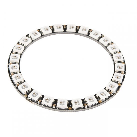 This is the 24 LED NeoPixel Ring from Adafruit, a small chainable 2.6" (66mm) outer diameter board equipped with 5050 WS2812 RGB LEDs. The WS2812s are each addressable as the driver chip is located inside the LED. Each NeoPixel Stick has ~18mA constant current drive so the color will be very consistent even if the voltage varies, and requires 5V.
