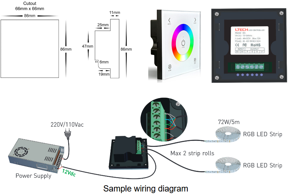 D3 Wall-mounted Touch Panel RGB Controller For 3528 5050 Multi-color LED Strip Lighting 12-24V 12A 144W 288W (5 Year Warranty)