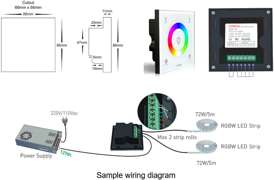 D4 Wall-mounted Touch Panel Full Color RGBW Dimmer Controller LED Strip Lighting 12-24V 16A 192W 384W (5 Year Warranty)