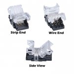 A 3 pin solderless flexible strip light 10mm wide connector designed to link waterproof strip light to 3 conductor extension wire. No stripping wire insulation nor waterproof coating layer of strip light. Determine wire gauge and length as you want in linear lighting project with this connector.Powerful,reliable,safe and easy to use.Free you from difficult and dangerous soldering iron operation. Price for 10 PCS.