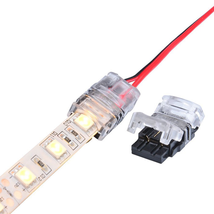 This 2 pin LED strip light connector is a perfect connecting solution for 10mm wide single color waterproof strip light.The free wire desgin allow you to DIY a connector with different cable you want. For example different wire gauge 22~18 AWG / 0.34~0.75 ㎜2,and length can totally be determined by yourself.This will give you really freedom in led strip light wiring. With clear cap that will not mask light of led strip,you can hardly find dark area in the led strip lighting space. Adopting our patent piercing contact connection technology,the connector's pin will pierce pcb to contact circuit of led strip then cap will clamp and fix strip light reliably. We use flame retardant PC to make the housing of the connector that means it is really safe to use. If you're looking for a lead connector to put between strip light and power supply or dimmer, it is the choice.