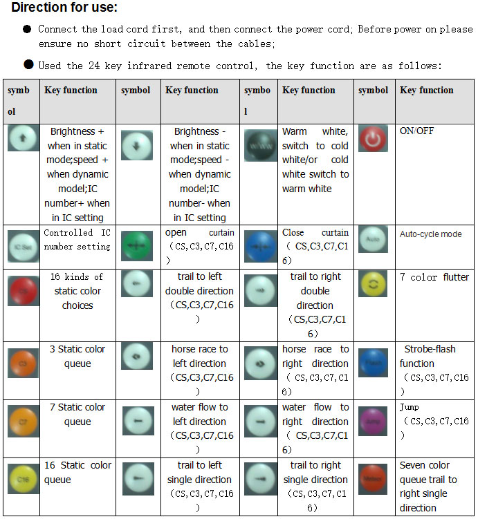 This 24 keys magic controller is mainly used to controlled the magic strips with the UCS1903 IC. Its with the power OFF memory function, and the controlled IC number are can be setting, max can controlled 1000pcs IC.its with 231 kinds of changing mode for user’s optional,can make the customer to experience various colorful changing models.Besides, its with the advantage of low price,easy to wire,simple to used.