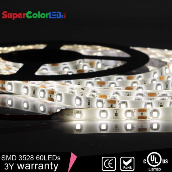 This flexible, weatherproof LED light strip is perfect for home lighting, accent lighting, task lighting, bias lighting, vehicle lighting, landscape lighting, motorcycle lighting, and more. Using up to 300 LEDs (3528 SMD), the light strip emits up to 76 lumens of powerful illumination per foot. The 16-1/2' LED light strip is available with a white, or black finish and can be easily cut into 3-LED segments and installed with its peel-and-stick adhesive backing. Designed to last 30,000 hours, the single-color light strip operates within a 9-14.8V DC range and is available in cool white, natural white, warm white, pink, blue, green, yellow, and red.